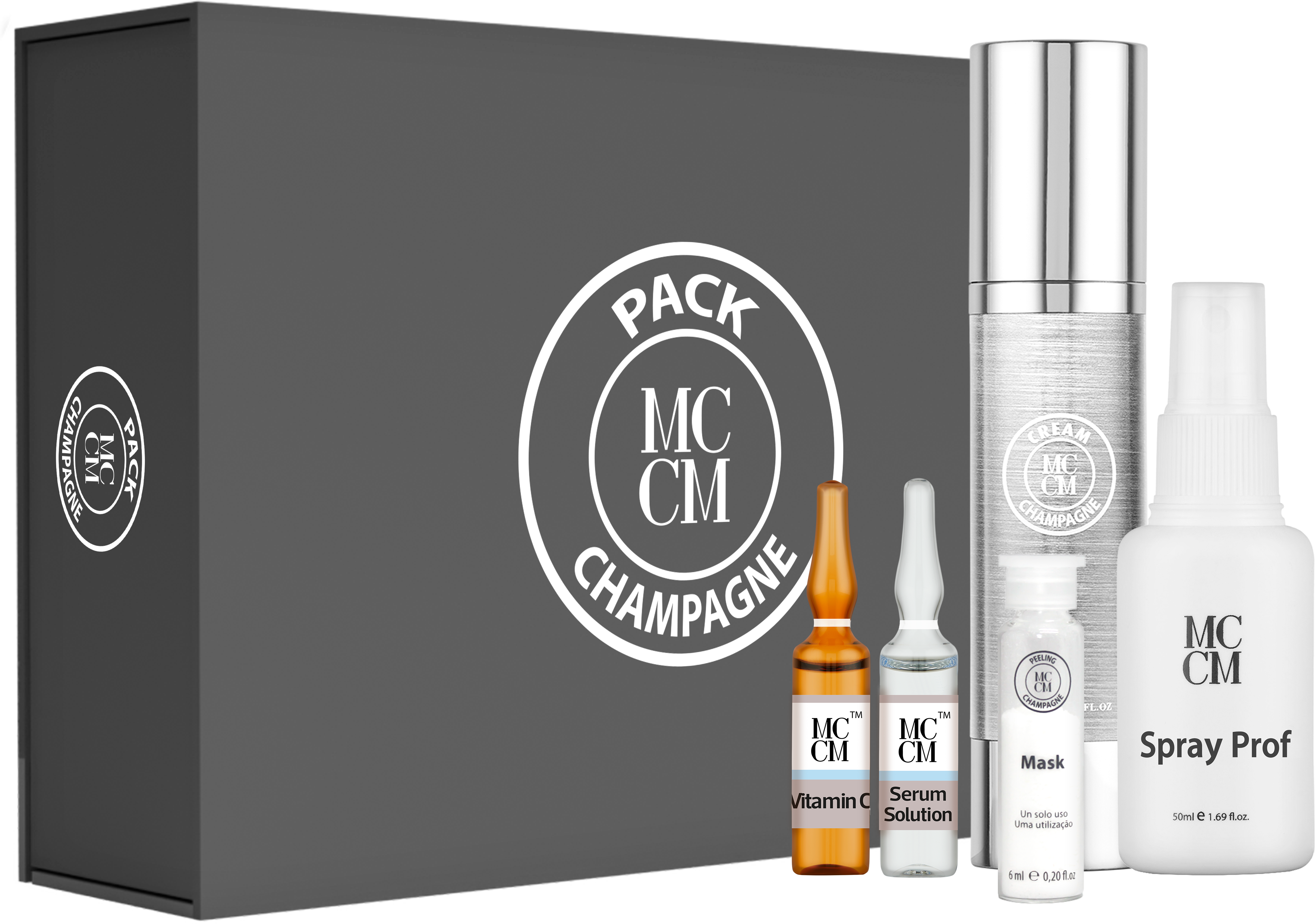 Pack Champagne is a set of products with ingredients that help exfoliate and renew the skin, promoting a smoother appearance.
